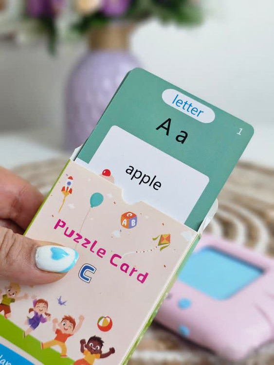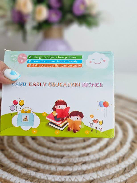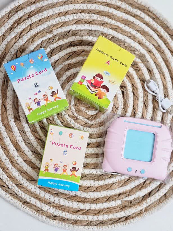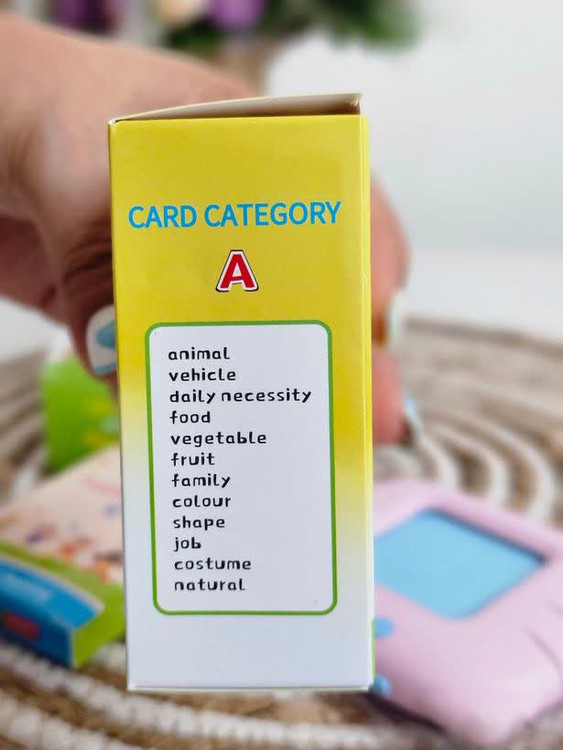 این کیت شامل یک دستگاه پخش صداست که با usb به شارژر متصل می شود و باعث می شود بی نیاز به باتری باشید. و به همراهش 255 عدد کارت دو طرفه وجود دارد 510 لغت که در هر طرف یک تصویر به همراه اسم آن تصویر کشیده شده است. کافیست دکمه ی روشن کیت را بزنید و کارت را از شیار وارد اسپیکر کنید. دستگاه نام انگلیسی و در بعضی کارتها مانند حیوانات صدای آن حیوان را پخش میکند.