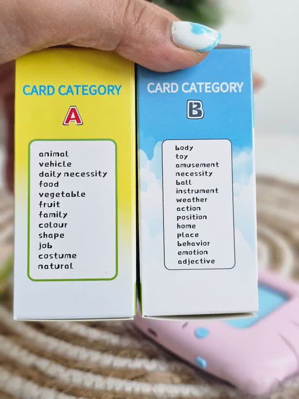 این کیت شامل یک دستگاه پخش صداست که با usb به شارژر متصل می شود و باعث می شود بی نیاز به باتری باشید. و به همراهش 255 عدد کارت دو طرفه وجود دارد 510 لغت که در هر طرف یک تصویر به همراه اسم آن تصویر کشیده شده است. کافیست دکمه ی روشن کیت را بزنید و کارت را از شیار وارد اسپیکر کنید. دستگاه نام انگلیسی و در بعضی کارتها مانند حیوانات صدای آن حیوان را پخش میکند.
